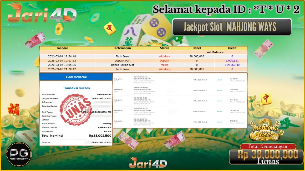Bukti JACKPOT MAHJONG WAYS Hari ini Di Situs JARI4D Sebesar Rp.38,000,000,- Tuntas !!