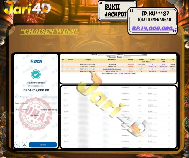 Bukti JP CHAISEN WINS Hari ini Di Situs JARI4D Sebesar Rp.14,000,000,- Tuntas !!