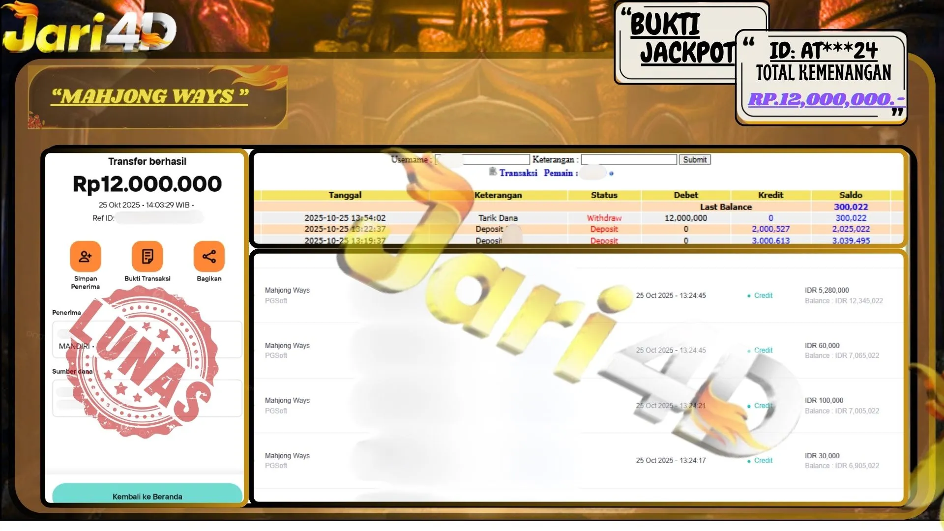 Bukti JP MAHJONG WAYS Hari ini Di Situs JARI4D Sebesar Rp.12,000,000,- Tuntas !!