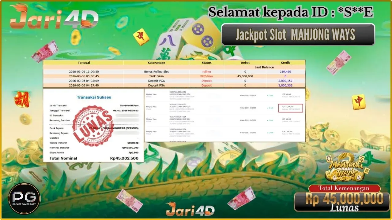 Bukti JP MAHJONG WAYS Hari ini Di Situs JARI4D Sebesar Rp.45,000,000,- Tuntas !!
