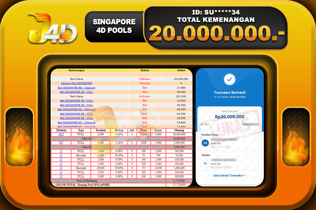 Bukti JP SINGAPORE POOL Hari ini Di Situs JARI4D Sebesar Rp.20.000.000,- Tuntas !!