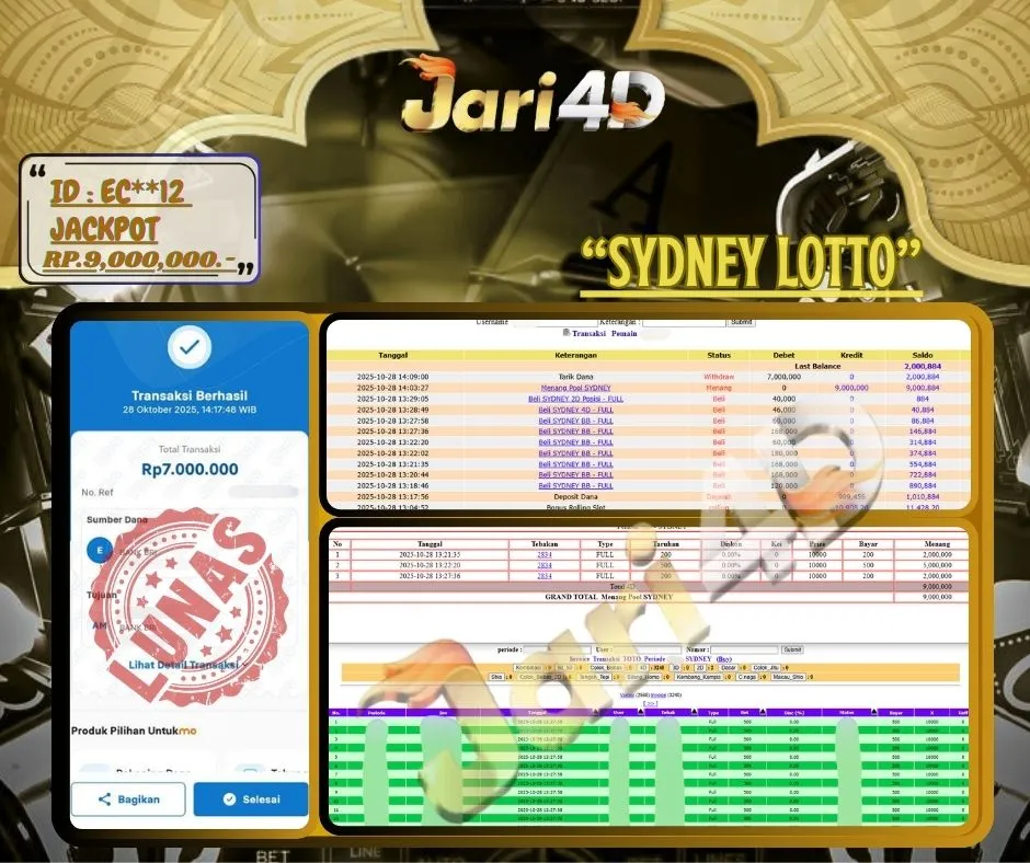 Bukti JP SYDNEY LOTTO Hari ini Di Situs JARI4D Sebesar Rp.9,000,000,- Tuntas !!