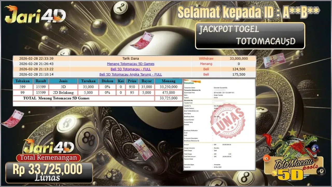 Bukti JP TOTO MACAU 5D Hari ini Di Situs JARI4D Sebesar Rp.33,725,000,- Tuntas !!