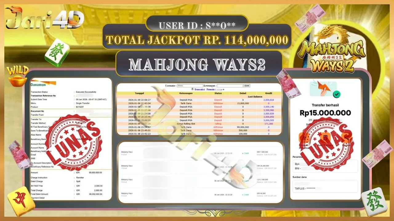 BUKTI WITHDRAW JARI4D KEMENANGAN JACKPOT MAHJONG WAYS 2 Rp.114.000.000,- LUNAS