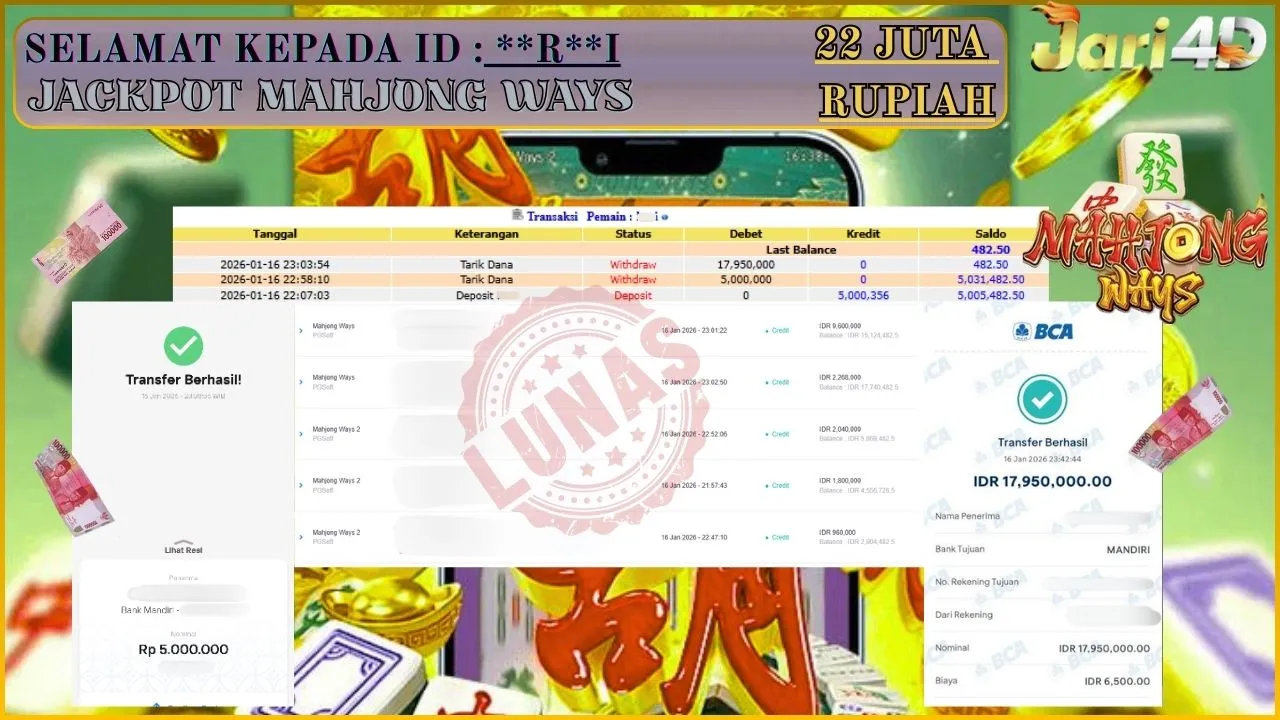 BUKTI WITHDRAW JARI4D KEMENANGAN JACKPOT MAHJONG WAYS Rp.22.000.000,- LUNAS