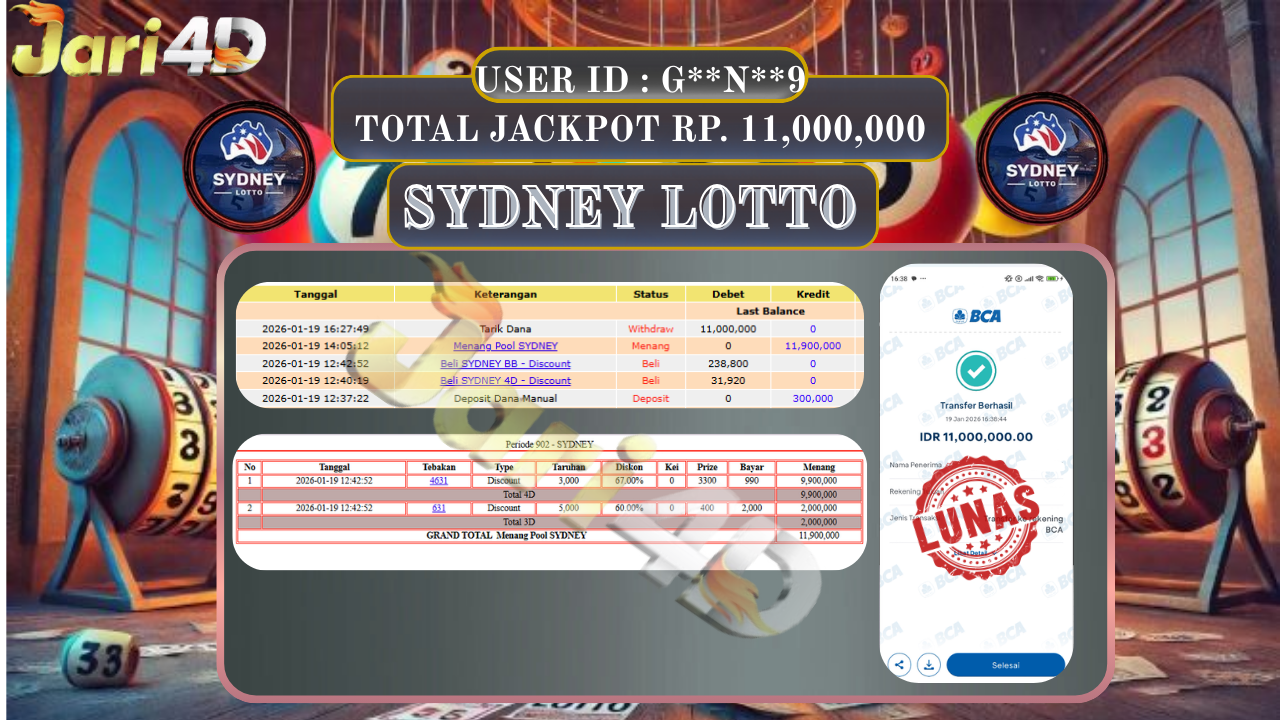 BUKTI WITHDRAW JARI4D KEMENANGAN JACKPOT SYDNEY LOTTO Rp.11.000.000,- LUNAS