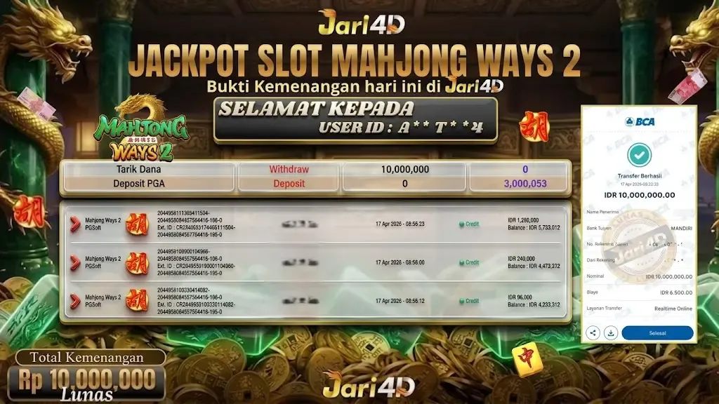 Bukti JP SLOT MAHJONG WAYS 2 Hari ini Di Situs JARI4D Sebesar Rp. 10,000,000,- Tuntas !! Read More »